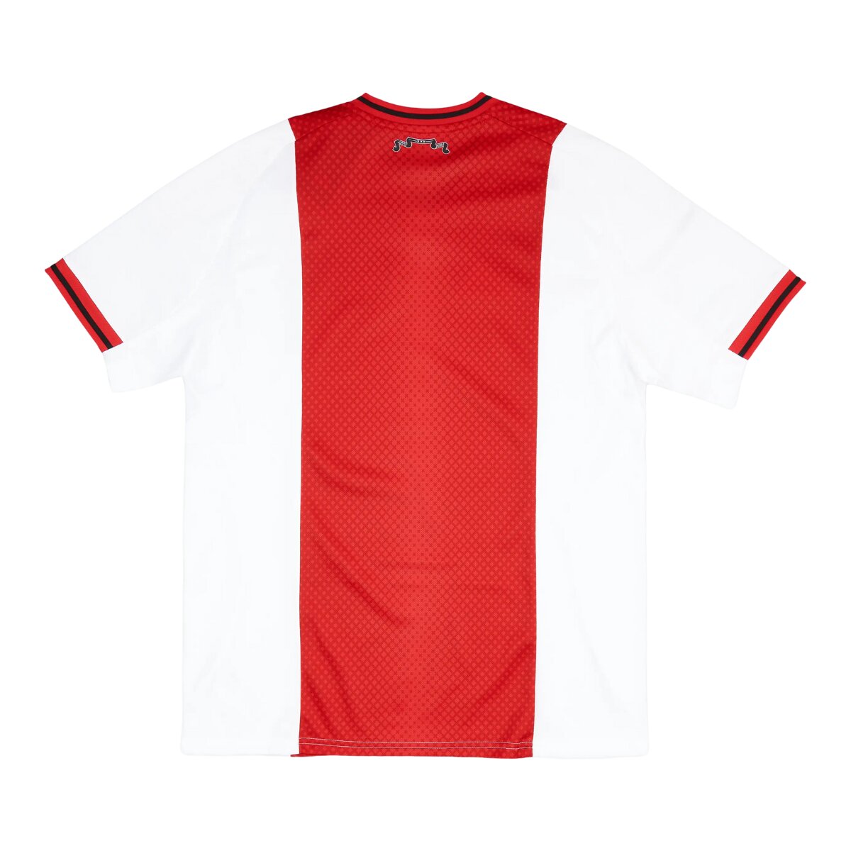 As laterais e mangas permanecem brancas, respeitando a tradição do clube, enquanto as três listras vermelhas da fornecedora percorrem os ombros com destaque. A gola em “V” é vermelha com detalhe preto na nuca, mesma combinação presente nos punhos, que remetem aos célebres “XXX” — símbolo marcante da cidade de Amsterdã. Um detalhe elegante e cheio de significado.