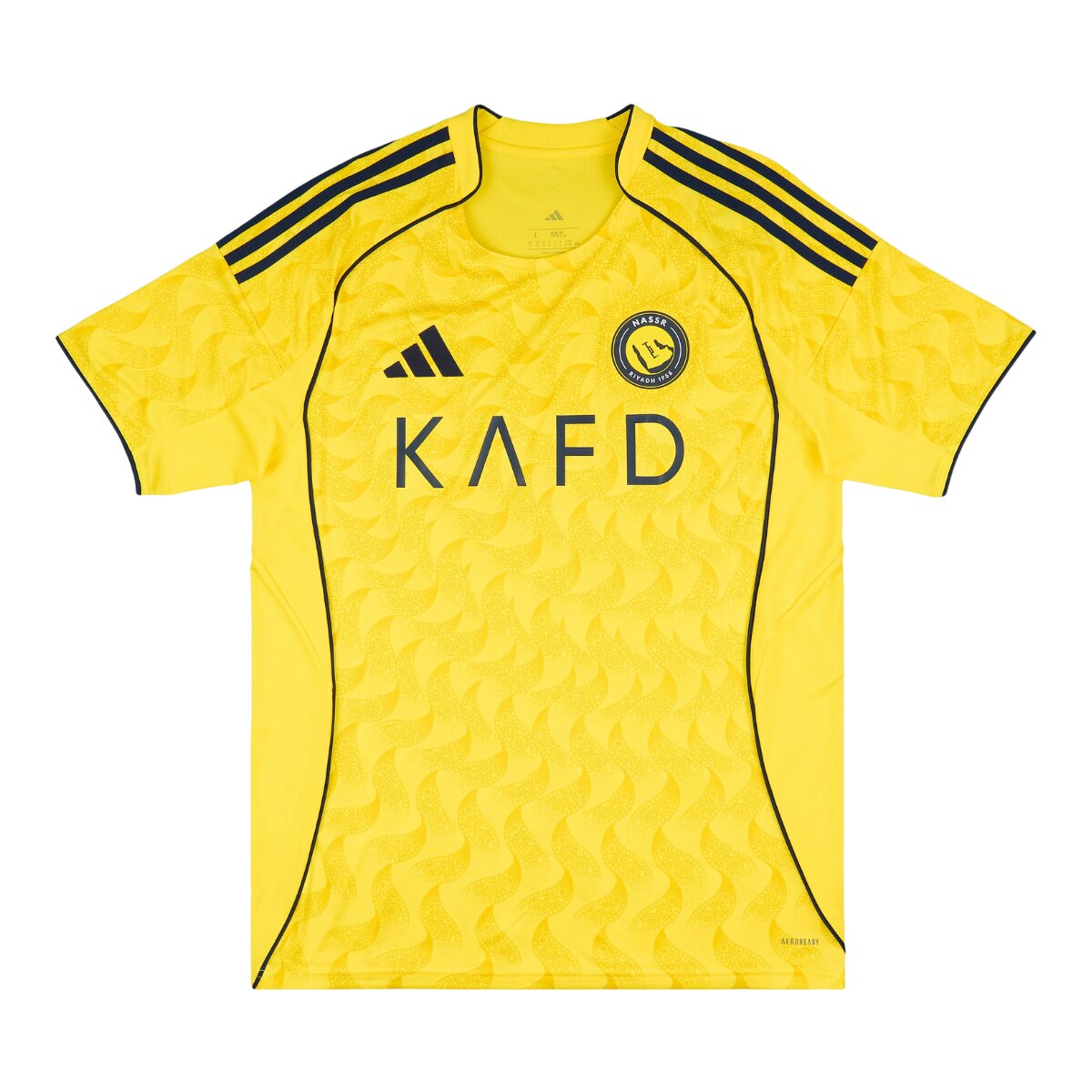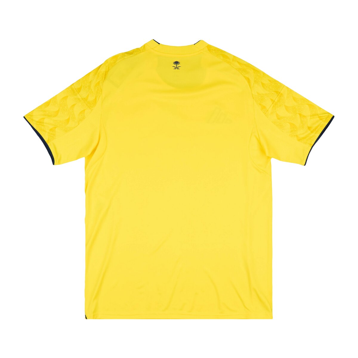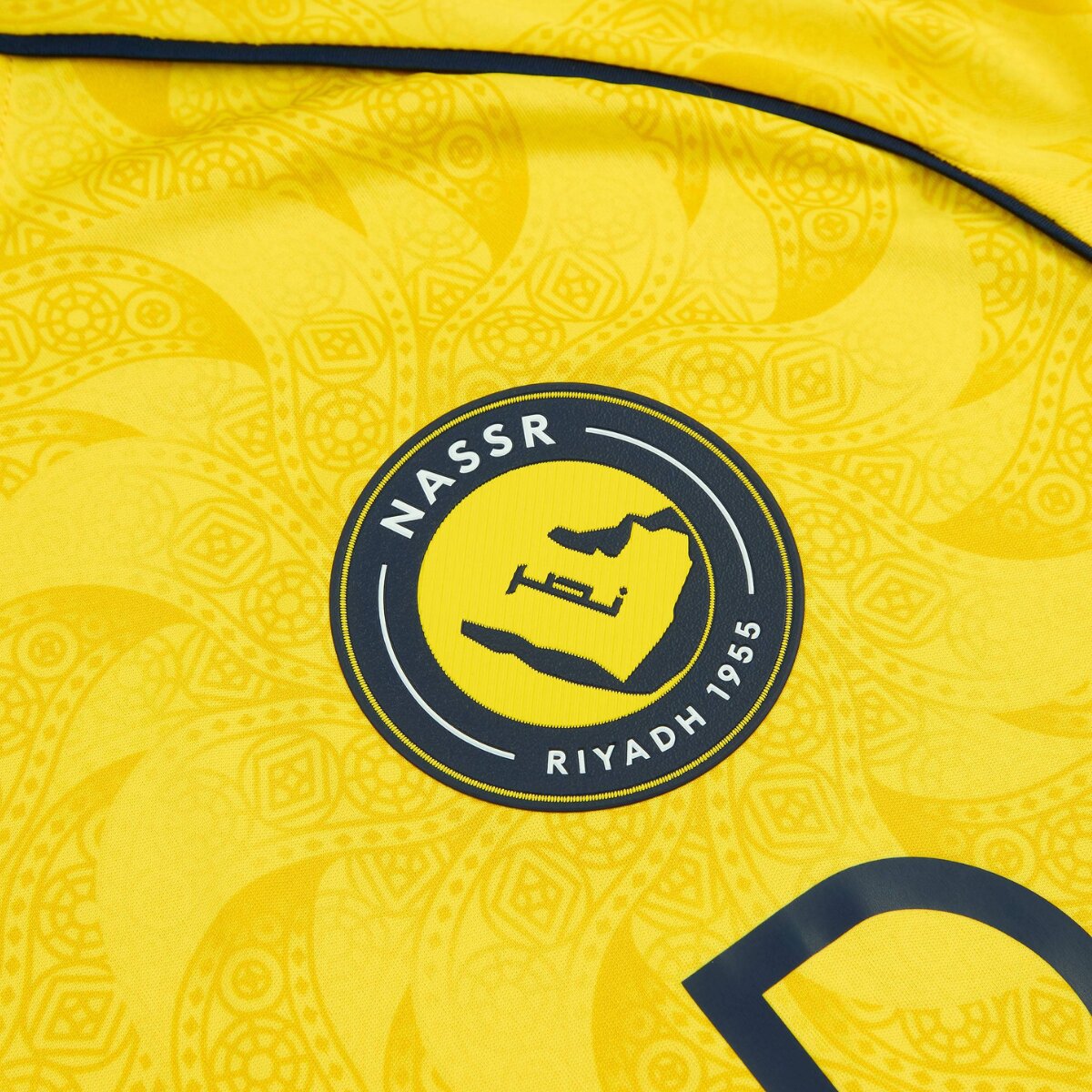 Com base em amarelo intenso, a camisa traz um gráfico em tom sobre tom inspirado no sol escaldante de Riad, representando a força e a resistência que marcam a identidade da equipe.