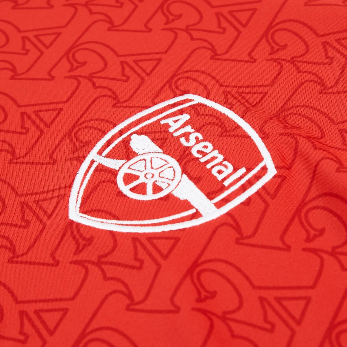 A gola branca, em formato clássico, se une às mangas brancas com filetes vermelhos nos punhos, criando uma estética equilibrada entre tradição e inovação. As três listras vermelhas nos ombros, marca registrada da fornecedora, acrescentam dinamismo ao design. Já nas costas, a camisa mantém o vermelho dominante, com o padrão do “A” em destaque, e a assinatura “Arsenal” centralizada na nuca em tipografia gótica branca — um toque final que exala autenticidade.