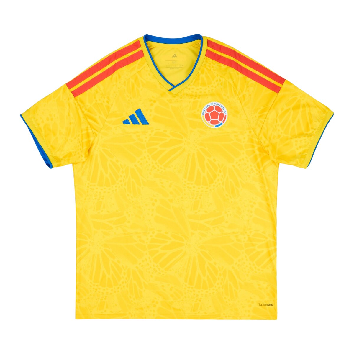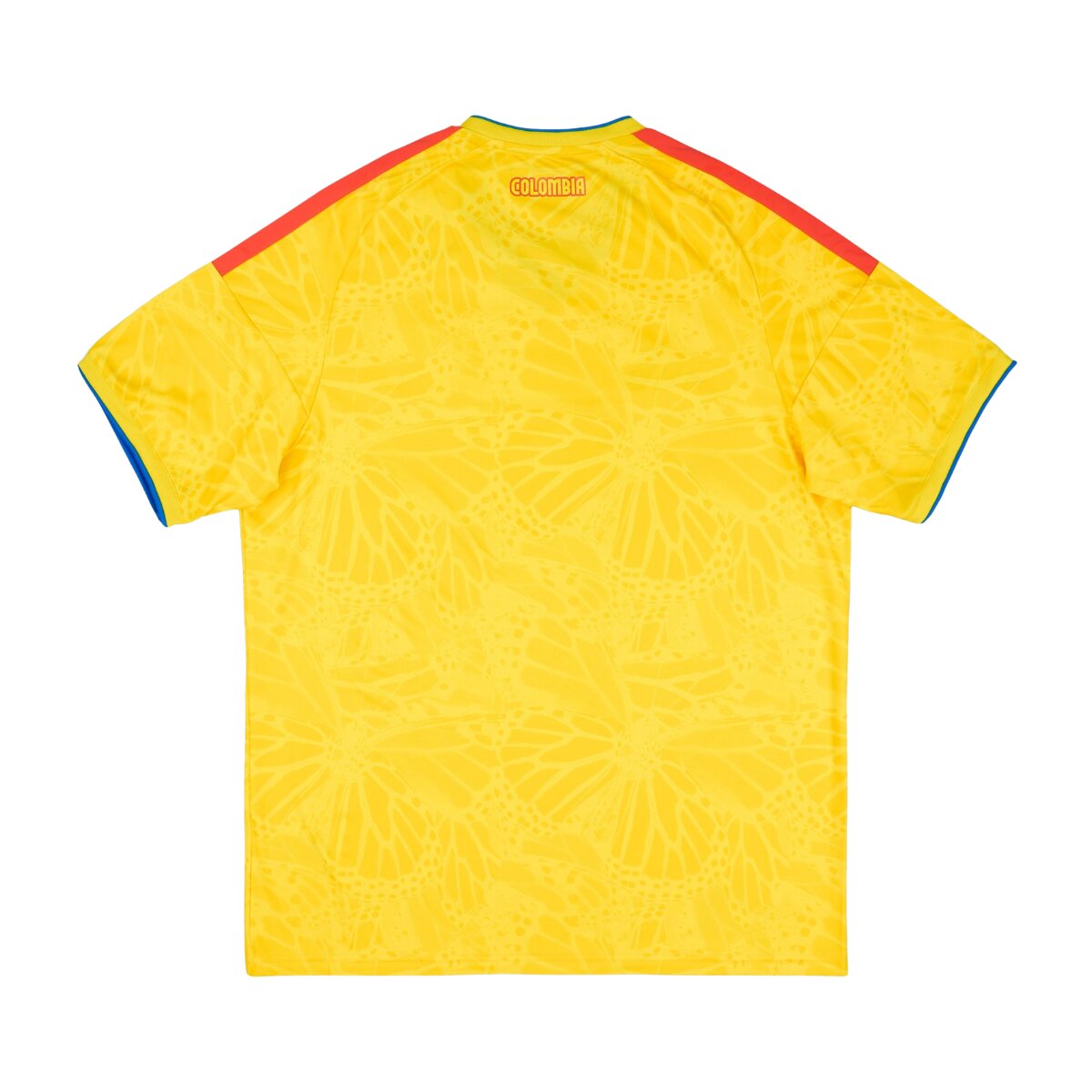 O uniforme titular mantém o amarelo vibrante como cor predominante, tom que simboliza a alegria, a energia e a identidade da seleção da Colômbia. Pelo corpo da camisa, surge um padrão visual inspirado nas borboletas amarelas, elemento fortemente ligado à obra de Gabriel García Márquez e ao realismo mágico, conectando futebol, cultura e história nacional.