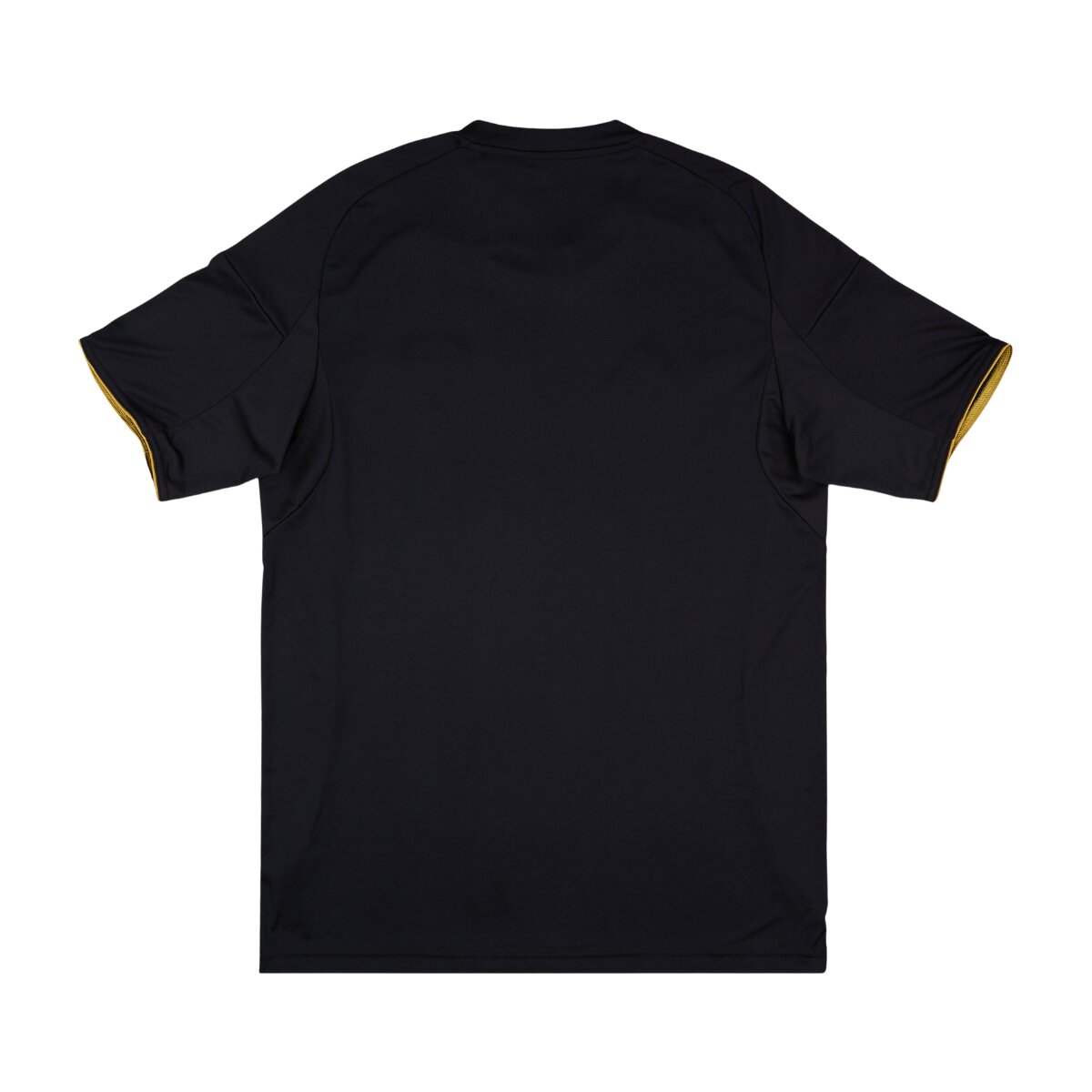 Com base preta clássica, o manto se destaca pelos detalhes em dourado nas três listras, punhos e recortes laterais, transmitindo elegância e imponência em cada detalhe. O escudo do clube surge em uma versão monocromática, com fundo preto e linhas douradas, reforçando o caráter exclusivo e refinado desta edição.
