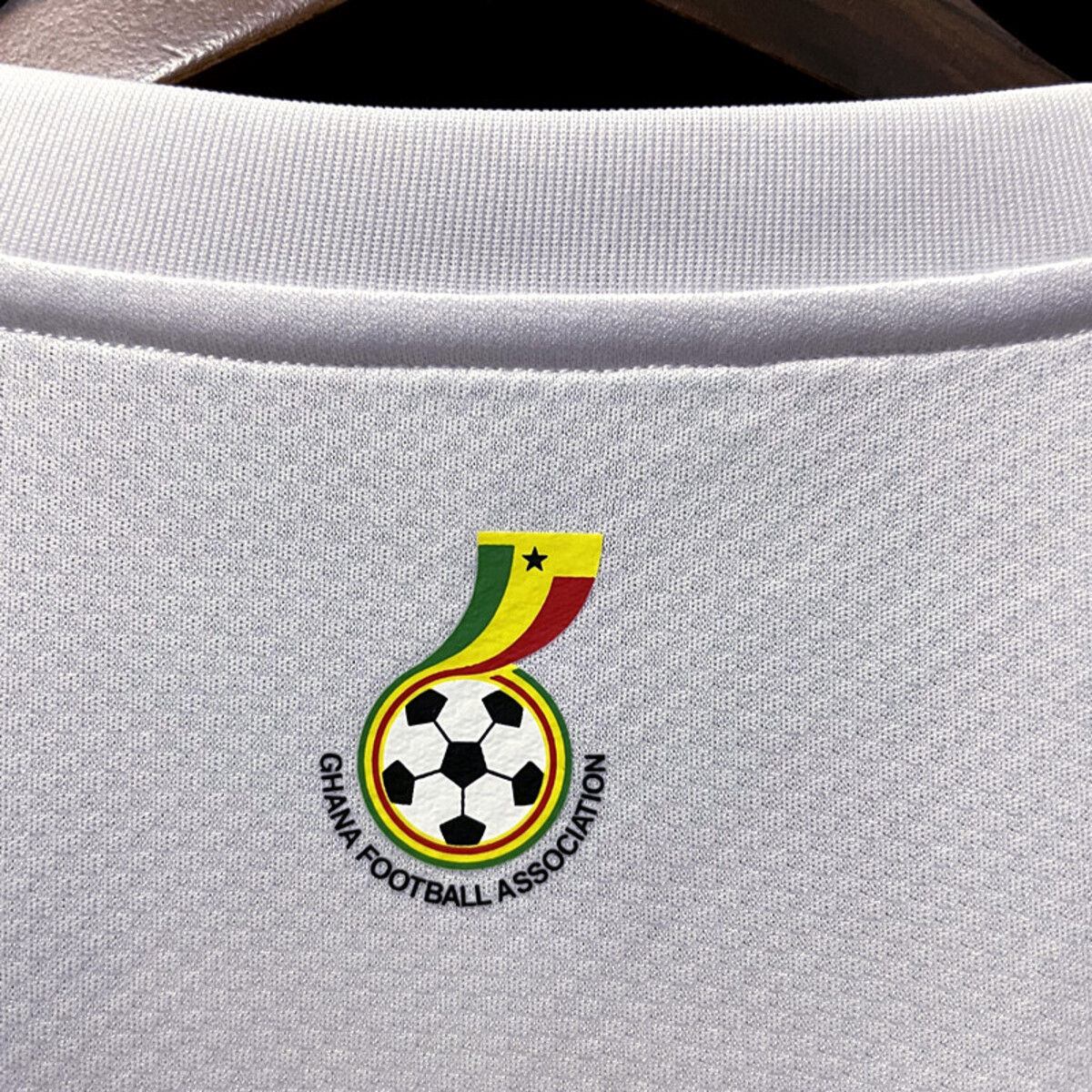 Apresentamos o Manto Titular da Seleção que vai conquistar corações: a Nova Camisa da Seleção Nacional! Embrance a grandeza da história da nossa seleção com o manto que homenageia momentos inesquecíveis, como a épica vitória por 3 a 2 sobre a Itália em 1996. A cor branca predomina, e o destaque fica por conta da estrela negra brilhando no centro do peito. Os punhos da camisa exibem as cores vibrantes da nossa bandeira – vermelho, amarelo e verde, proporcionando um toque de energia e paixão a cada movimento em campo. A gola, com seu detalhe em amarelo na parte frontal, adiciona um toque de estilo e autenticidade. O escudo da Federação Ganesa encontra seu lugar de destaque no lado esquerdo, exibindo a versão atual padrão com todo o orgulho e tradição que representa.