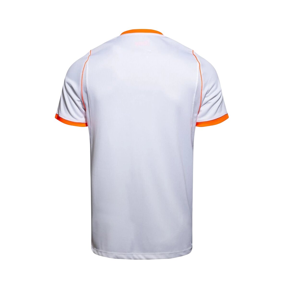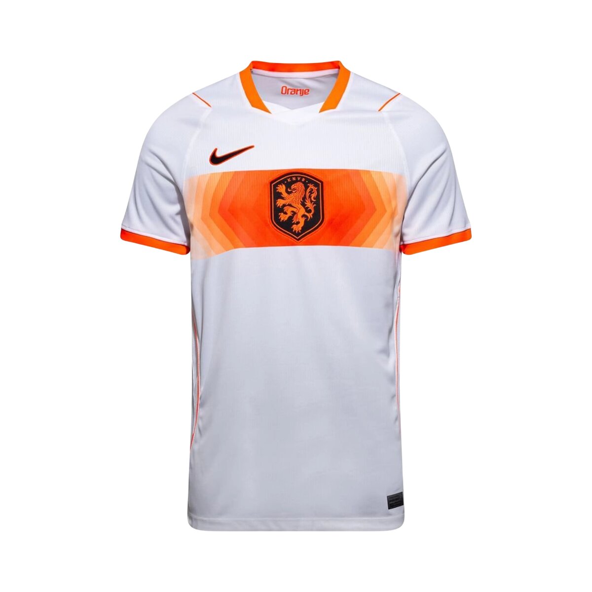 A gola em formato V contemporânea adiciona elegância ao design sem comprometer o visual esportivo da peça. Os acabamentos laterais em laranja reforçam a identidade da equipe, criando um equilíbrio visual perfeito entre a base branca e o laranja que define a Oranje. O escudo aparece centralizado, com destaque que valoriza a identidade da seleção sem disputar atenção com os elementos do design.