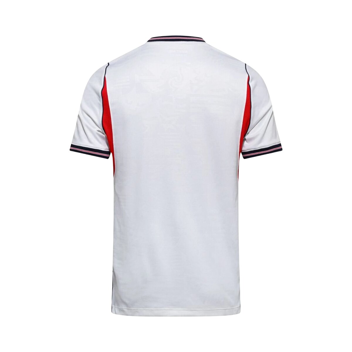 O padrão gráfico sutil em relevo que percorre o tecido é o elemento que transforma esse uniforme em algo verdadeiramente especial. A textura visual criada por esse trabalho confere profundidade e sofisticação à peça sem competir com o visual limpo e clássico que define a camisa. É o tipo de detalhe que só se descobre de perto, e que faz toda a diferença para quem entende de design esportivo.