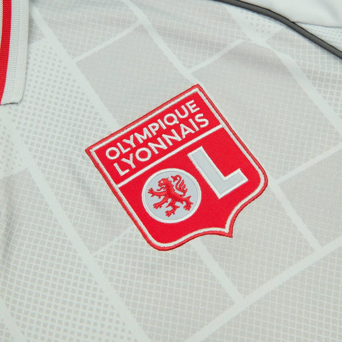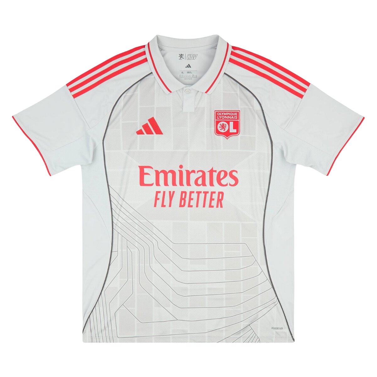 A nova Camisa Lyon 25/26 Third traz um design moderno em cinza, com gola polo estilizada e detalhes em vermelho, celebrando o espírito urbano e inovador do Olympique de Lyon.