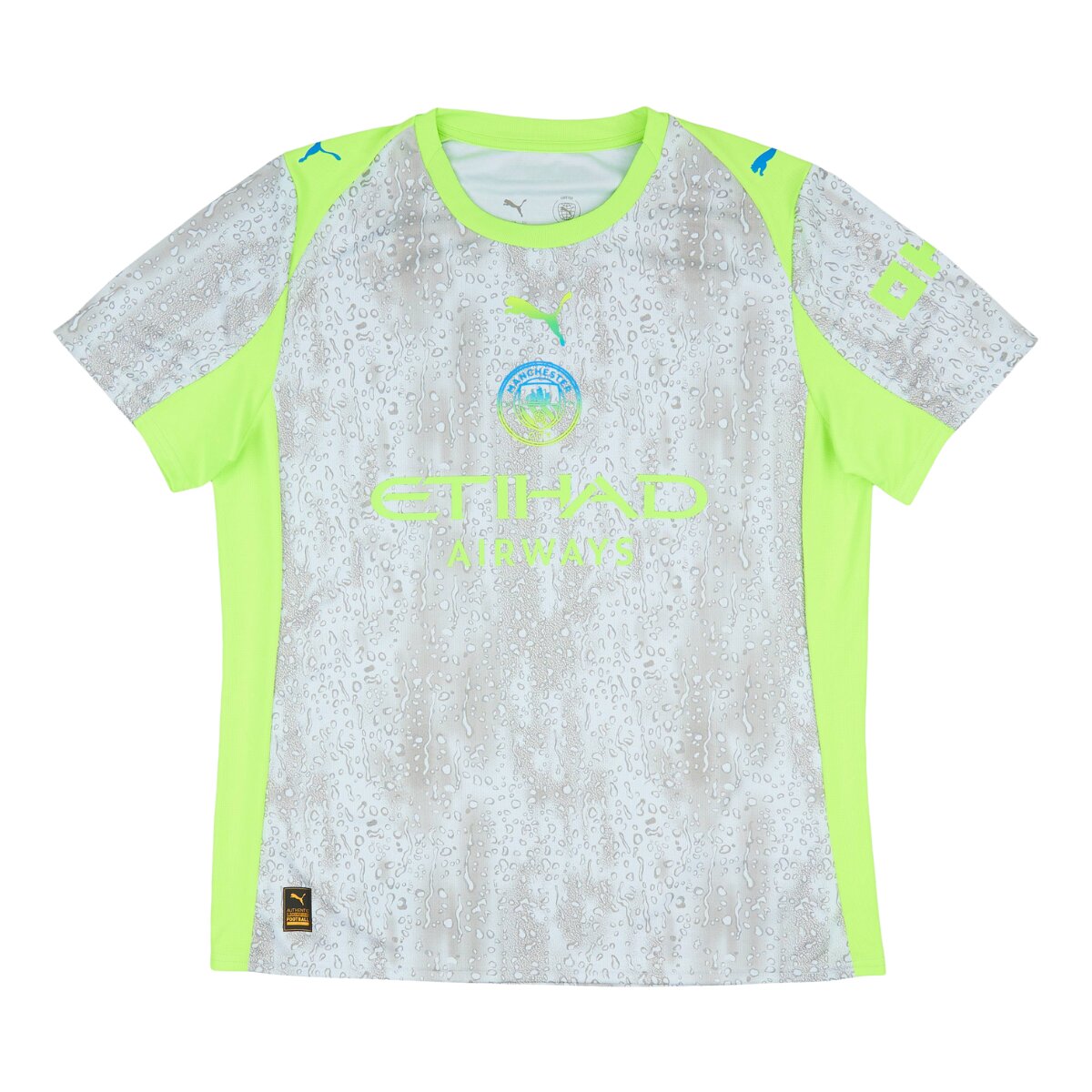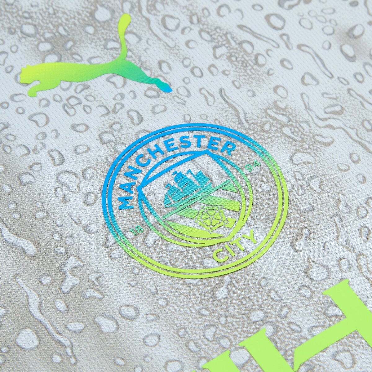 A terceira camisa Manchester City 25/26 traz como inspiração a própria cidade de Manchester: cinza predominante que remete ao asfalto e ao céu típico da região, traduzindo a essência urbana do clube. O destaque fica para o padrão de gotas de chuva presente em toda a peça e no shorts, um detalhe marcante que conecta o uniforme ao clima característico da cidade.