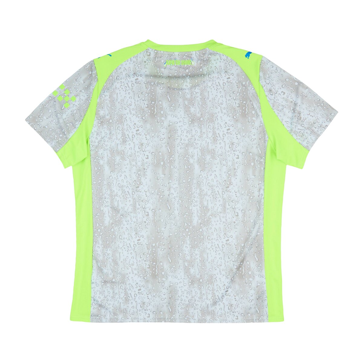 Para contrastar com o tom sóbrio, o uniforme recebe vibrantes detalhes em verde neon no pescoço, ombros e painéis laterais, criando um visual moderno e impactante. O escudo transparente faz referência à aparência da água em vidraças, enquanto o gradiente de verde para azul no logotipo centralizado completa a estética inovadora da temporada.