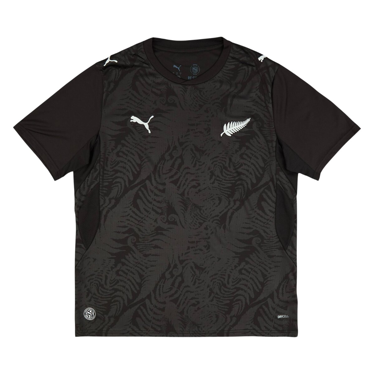 A base preta dominante reforça o visual clássico da equipe, tornando essa camisa titular Nova Zelândia uma escolha imponente para qualquer torcedor. O design traz um padrão visual sutil ao longo do tecido, criando profundidade e destacando o acabamento moderno da peça.