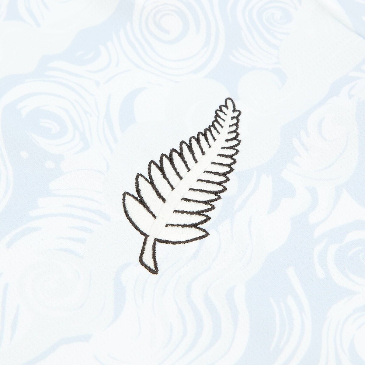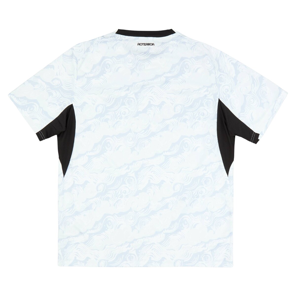 A base branca predominante reforça a identidade da equipe e faz jus ao apelido All Whites, entregando um visual limpo e sofisticado. Ao longo do tecido, um padrão visual sutil em repetição contínua adiciona profundidade ao design, criando um efeito diferenciado mesmo dentro de uma proposta minimalista.
