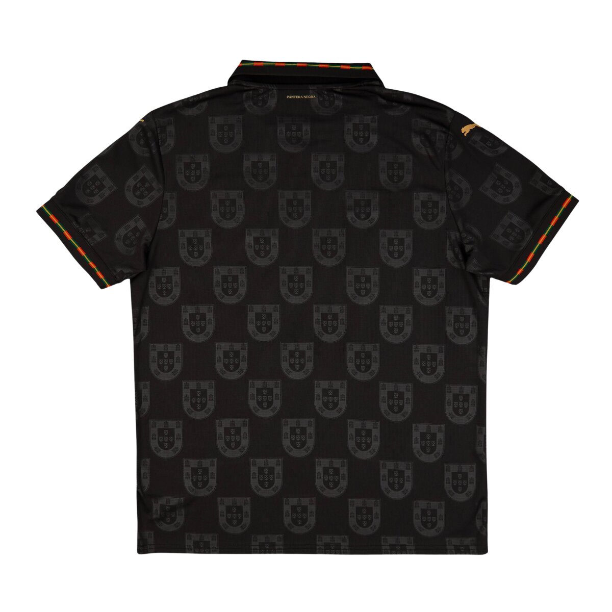 Com base totalmente preta, o manto apresenta um mosaico brilhante de brasões de Portugal, formando um padrão marcante e único que exalta a cultura e o orgulho nacional. A gola polo preta recebe um acabamento refinado com uma linha dourada acompanhada de sutis detalhes em vermelho e verde, cores que remetem diretamente à bandeira portuguesa, detalhe que também aparece nos punhos.