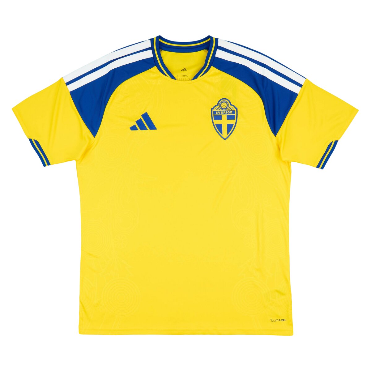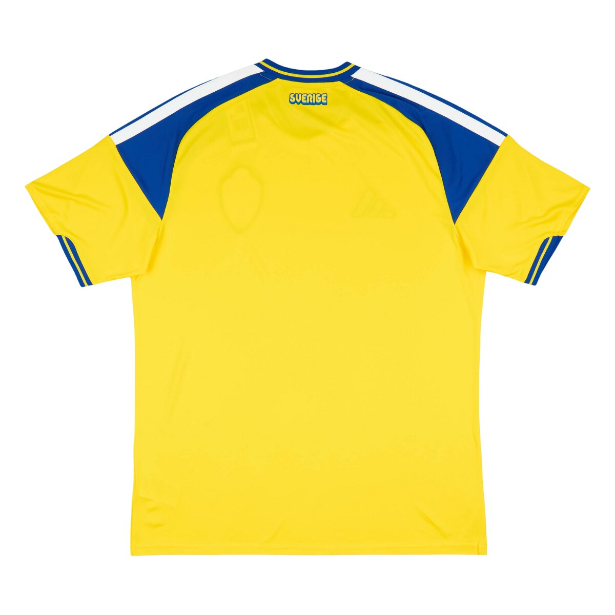 No peito, o escudo da Federação Sueca de Futebol (SvFF) aparece no lado esquerdo, simbolizando a tradição e a história da seleção. No lado direito, o logo da adidas surge em azul, mantendo a harmonia visual. Já na parte traseira da nuca, o nome do país em sueco é aplicado com tipografia inspirada nos anos 1970, reforçando o conceito cultural do uniforme.
