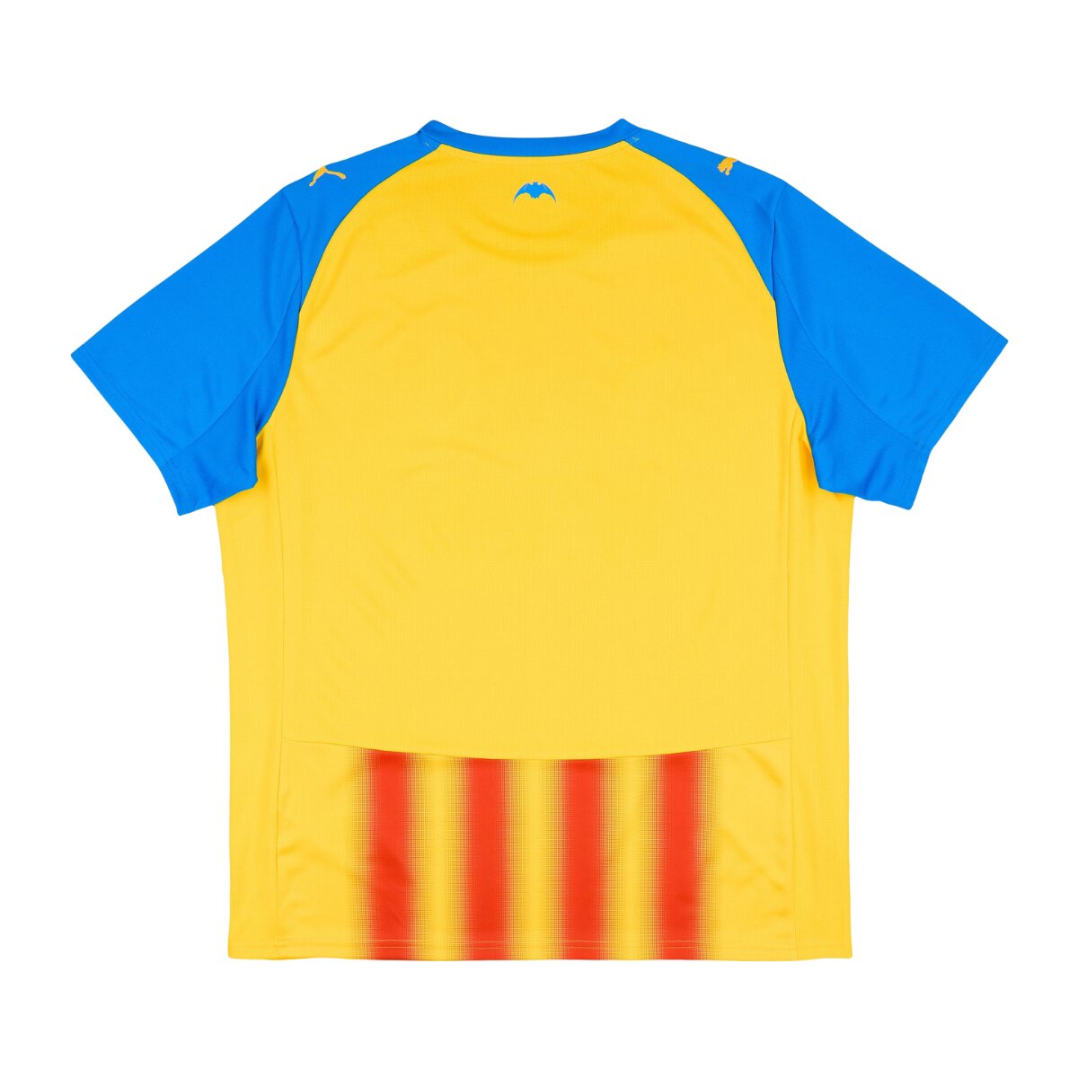 A gola redonda e as mangas em azul criam um contraste marcante, enquanto as costas do manto trazem a base amarela com o degradê sutil na parte inferior, garantindo um visual limpo, atual e cheio de personalidade. Para completar, o famoso morcego, mascote do clube e figura histórica no escudo do Valencia CF, aparece na nuca como um selo de autenticidade e orgulho.